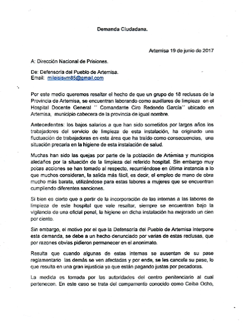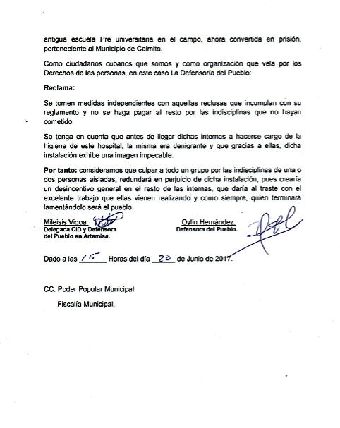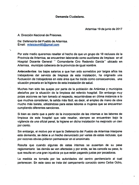 Sin embargo, el motivo por el que la Defensoría del Pueblo de Artemisa interpone esta demanda, se debe a un hecho denunciado por varias de estas reclusas, que por razones obvias pidieron permanecer en el anonimato.