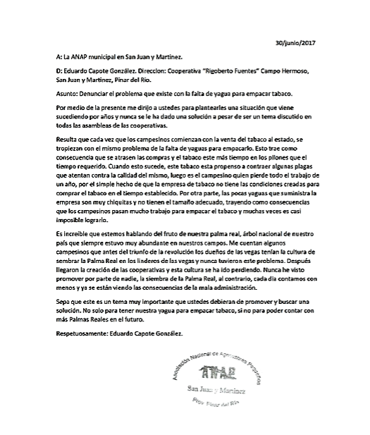 Asunto: Denunciar el problema que existe con la falta de yagua para empacar tabaco.