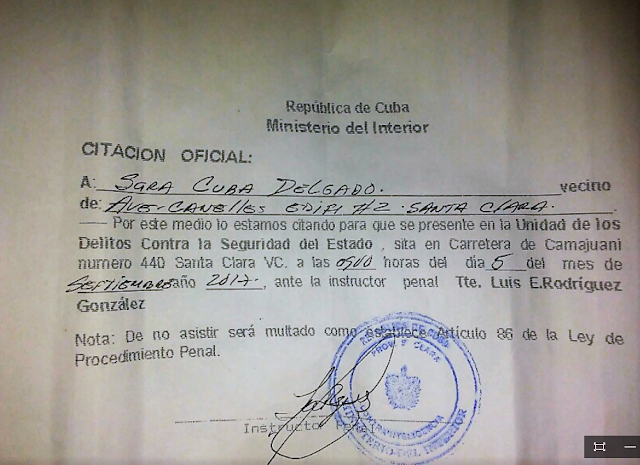 Saludos a todos, les envío una citación que me hicieron luego de una reunión efectuada en mi casa ,sede principal del CID en Villa Clara, por una visita de la Defensoría del Pueblo que realizamos a un campesino que la dictadura le quitó sus tierras.